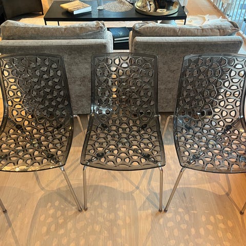 2 stk. spisebordstoler i svart plast. Ben i svartlakkert stål. Sittehøyde 45 cm. Selges samlet.
