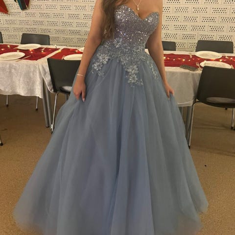 Selger denne nydelige ball kjolen . Vi har kjøpt den på tise og mi jente har brukt den 1 gang på ball. Nypris på disse er 5500kr. Jenta som har brukt den er 172 høg. Kan brukes fra xs til m pga knytting bak.