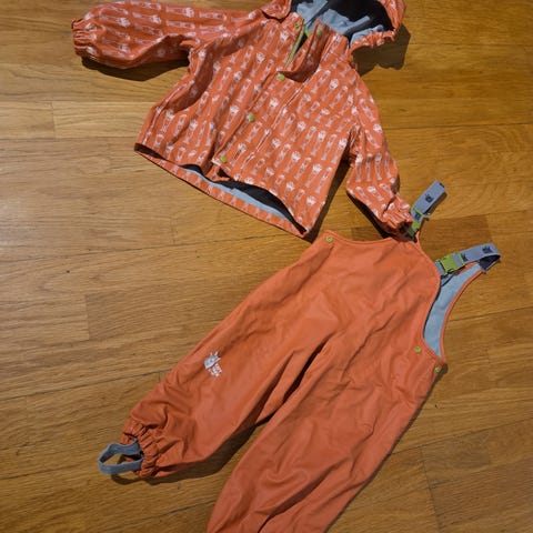 Kattnakken regndress i størrelse 86. Godt brukt med en del mangler og selges derfor billig.