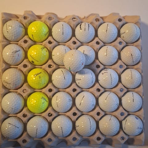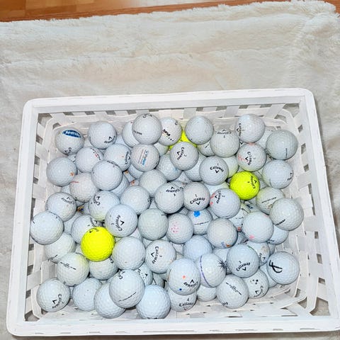 Callaway golfballer i flere farger, inkludert hvit, grønn og hvit med røde detaljer. Egnet for golfspillere som trenger baller i ulike farger for bedre synlighet og variasjon på banen.