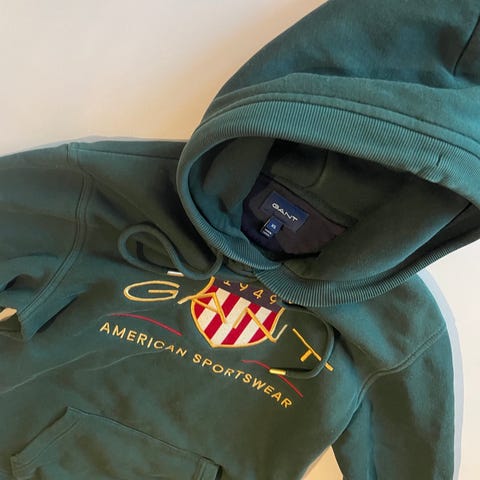 GANT hettegenser i blå farge, størrelse 170cm for herre. Laget av bomullsmateriale og polyester Genseren har hette og frontlogo med GANT-tekst og emblem. Det er noen små hull på plagget, som vist på bilde. Nypris 1000kr