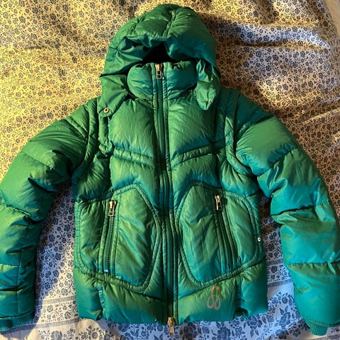 Ukjent alder , men varm dun /fjør jakke . Avtagbar hette , armer .