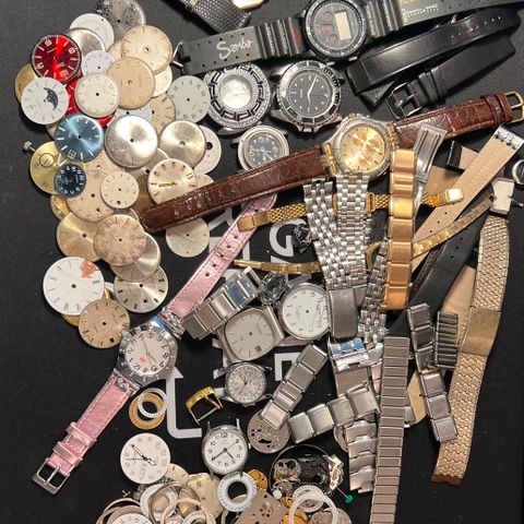 Samling med ulike armbåndsur og løse klokketøy selges samlet. Dette er et parti for reparasjon, deler eller hobbyprosjekter. Ingen klokker er testet, og funksjon kan ikke garanteres.