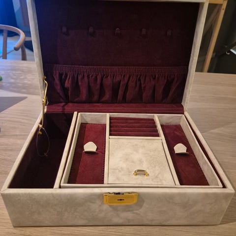 Smykkeskrin med mange skuffer, inndelinger og speil selges. Praktisk til å oppbevare smykkene i. Lite brukt.