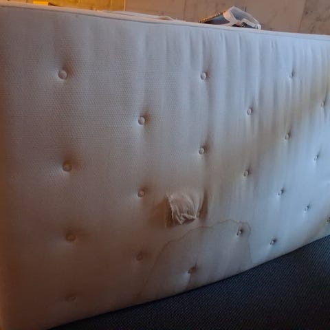 God madrass som trekket kan vaskes på. Brukt av lite barn og er noen tissemerker ,men kan vaskes.
