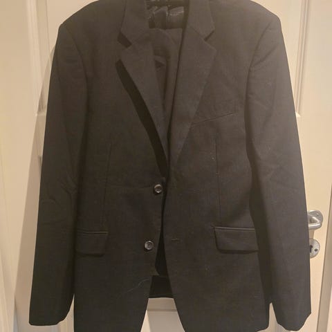 Pent brukt svart dress i ull selges for kr 300,-. Det står ingen størrelse i jakken, men i buksen står det str. 52 (EUR). Det tilsvarer Large, men jeg synes den ser mer ut som Medium.