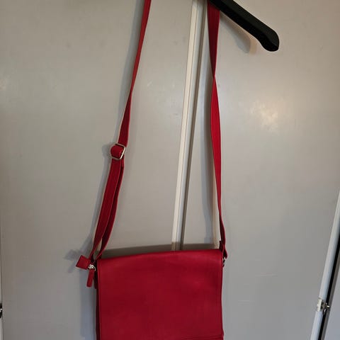 Skinnveske for dame i brun farge. Laget av lærmateriale med justerbar skulderrem. Vesken har flere lommer, inkludert en glidelåslomme på innsiden og en baklomme med glidelås. Passer til daglig bruk og oppbevaring av personlige eiendeler. Se mål på bilder.