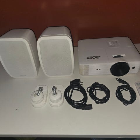 Planen var å ha den i kjeller på treningsrom. Ustabilt nett i kjelleren, så har valgt å kjøpe en liten tv som skrus opp på veggen. Projektor kun åpnet og testet at den funker.