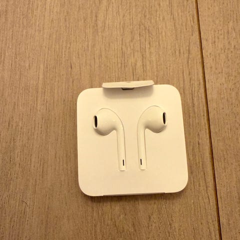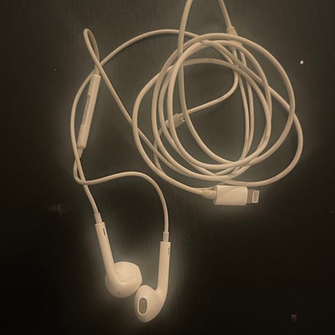 Apple ørepropper med Lightning-kontakt, hvit farge. Designet for bruk med kompatible Apple-enheter med Lightning-port.