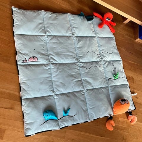 IKEA KLAPPA lekematte med størrelse 114x114 cm. Lekematten har et design med flere fargerike figurer. Matten er vasket før salg.