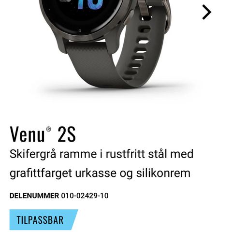 Selges fordi jeg har fått en ny klokke selv. Veldig fin og feminin smartklokke. Klokken har en ripe i skjermen som ikke har noe å si for bruken. Ripen synes ikke så godt når klokken er skrudd på. Venu 2S tåler vann, kan spille musikk, vise body battery og søvnscore med mer. Lader følger med. Jeg tror jeg har esken et sted også, og kan eventuelt lete mer etter den om ønskelig. Kan sende, ellers kan den hentes/leveres i Sarpsborg.