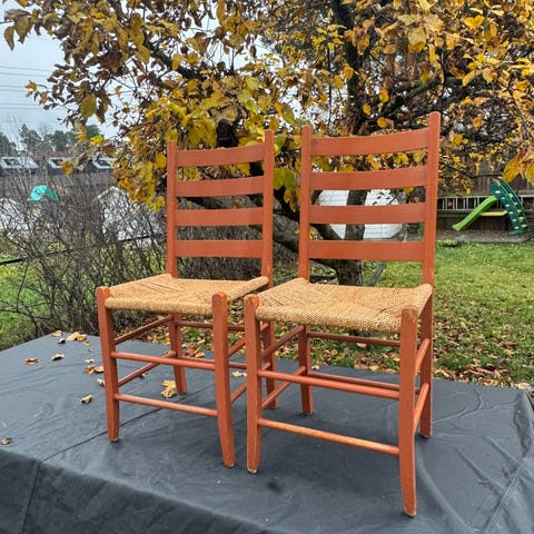 Jærstol med sjøgress i setet. Den er 84 cm høy og sittehøyde på 48cm. Den er i god stand og har mange år igjen. Selges billig fordi jeg trenger plassen.