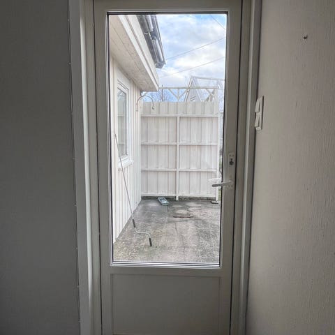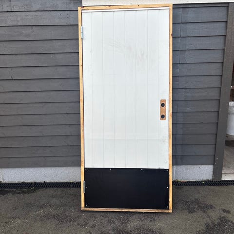 Grønnmalt tredør med karm. Trenger litt puss og maling, så har den flere gode år igjen.