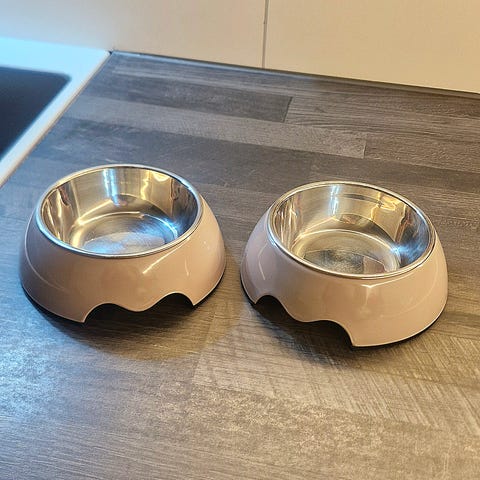 Vann og matskål. Ser veldig pene ut. Kjøpt på musti