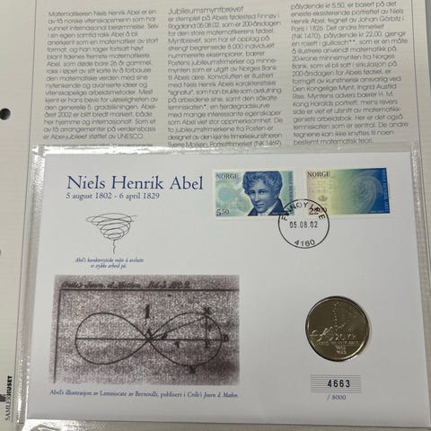 Minnebrev til ære for Niels Henrik Abel med tilhørende frimerker og mynt. Inkluderer illustrasjoner og poststempel. Nummerert utgave for samlere, nr 1350. Gi bud. Så sender jeg i posten.
