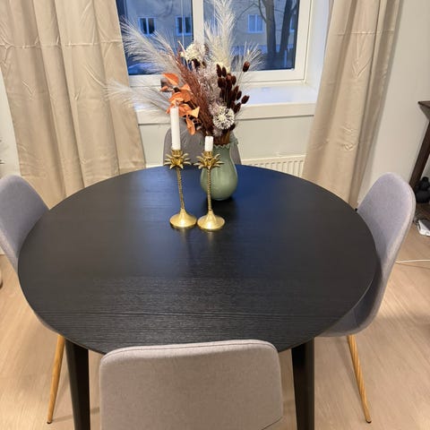 Rundt spisebord i svart selges. Bordet har ileggsplate, slik at det enkelt kan utvides ved behov – praktisk når man har gjester.