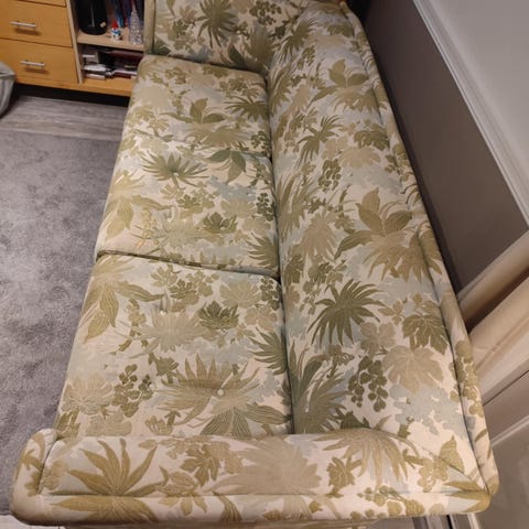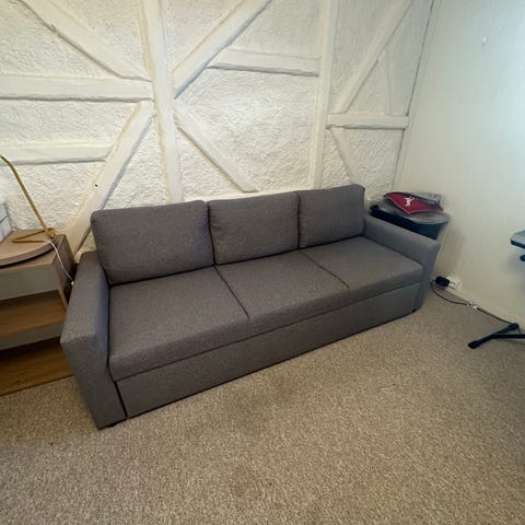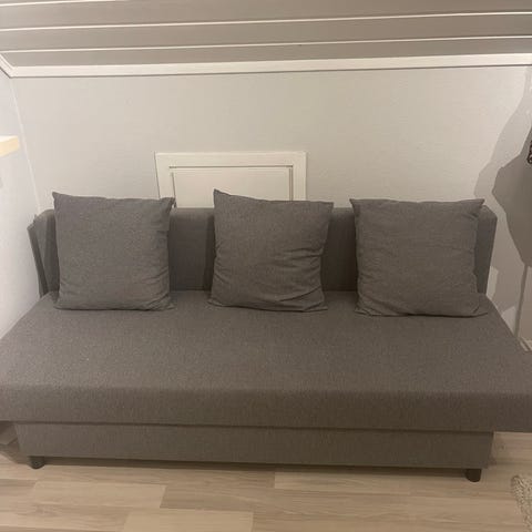 Plass til 1 person. Her ligger du godt. Sofaen fungerer også godt som en vanlig 3 seter sofa. Fin både til både hybel, i leilighet og på gjesterom/barne- og ungdomsrom. Armlene kan tas/skrus av. Må bort.