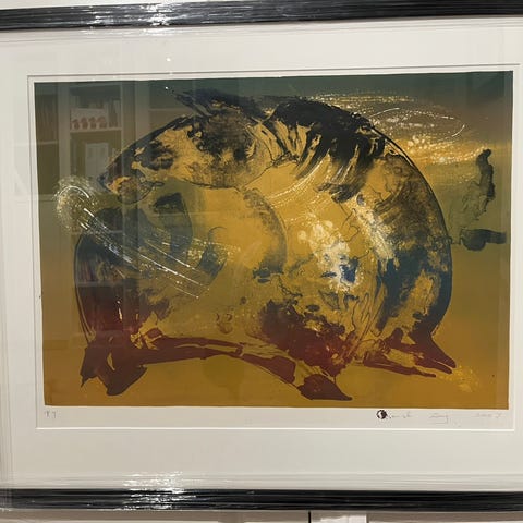 Stian Skjæveland Kystlandskap maleri med ramme. Motiv av kystlandskap med steiner og hav, signert av kunstneren. Maleriet er innrammet i en dekorativ ramme med detaljer i gull og svart. størrelse 60 x 50