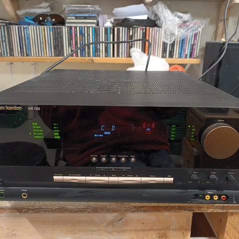 slike hjemmekino forsterkere med alle muligheter har jeg ingen som helst greie på. jeg spiller bare på enkle stereo forsterkere . så her er det vanskelig å svare på spørsmål. det eneste jeg har testet den opp mot er en cd spiller, og der var alt helt topp. spilte på både front og senter høyttalere. i pen estetisk stand. uten fjernkontroll. denne må bare kjøpes som den er , og hentes.