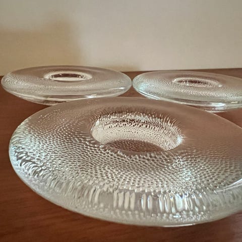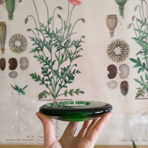 Designet av Markku Salo. Stilig grønt glass med bobler. I pen stand. 12 cm i diameter.