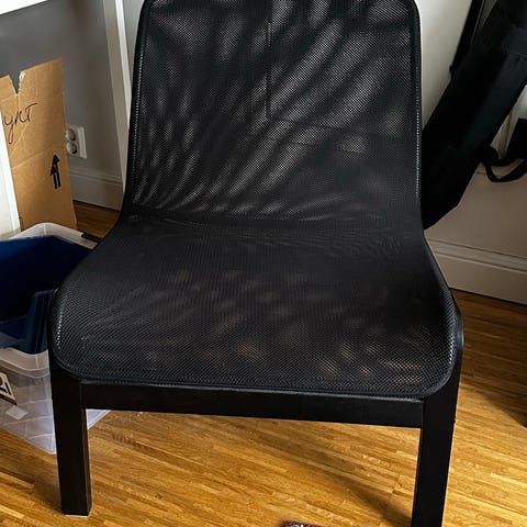 Lenestol med fotskammel i stolen. Denne har en liten defekt under, men den virker likevel.