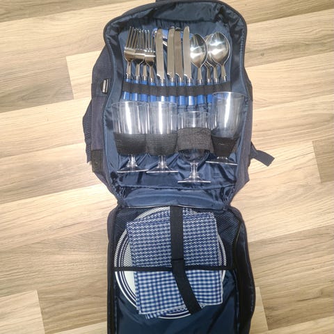 Illumina pikniksett som inkluderer bestikk, kopper, og tilhørende bager for oppbevaring. Settet har et rutete mønster i blått og hvitt, og er designet for enkel transport og bruk ved utendørsaktiviteter.