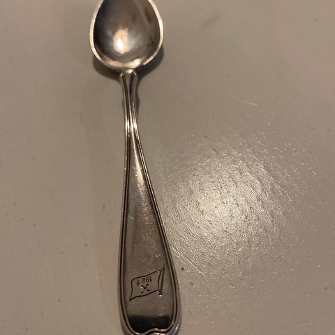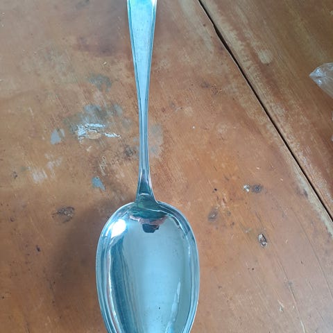 Religiøs skrifter på spaden og kvinnefigur. Antar at det ikke er sølv.