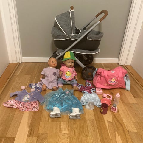 Baby Born dukke med tilbehør inkludert flere sett med klær og sko i ulike farger og stiler, samt rosa dukkevogn og bæresete. Dukken og tilbehøret er laget for barn.