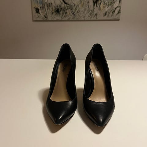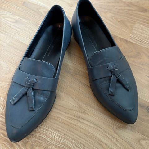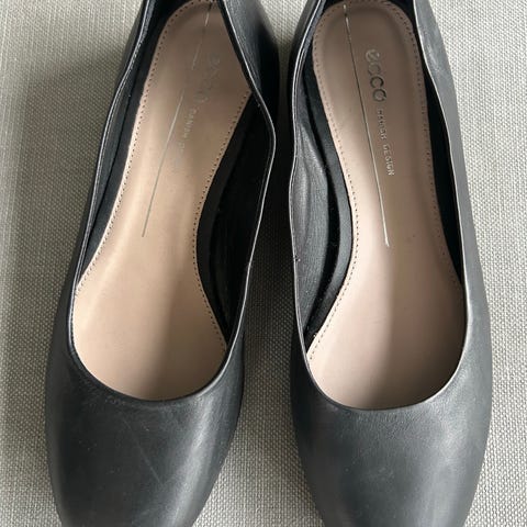 Nesten ubrukte pensko i skinn fra Ecco i en mørk blåfarge. En feminin sko med 45 mm høye hæler. Elegant og minimalistisk design. Laget for allsidig bruk med gode såler og god passform. Passer derfor godt både til jobb og pent.