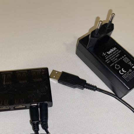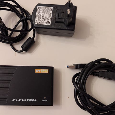 Adapteren gir mulighet for tilkobling av flere USB-enheter samtidig. Kompakt design med integrert kabel og blått indikatorlys for tilkoblingsstatus.