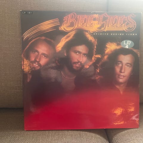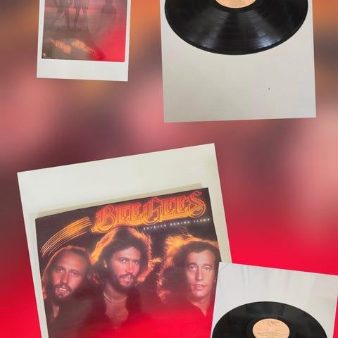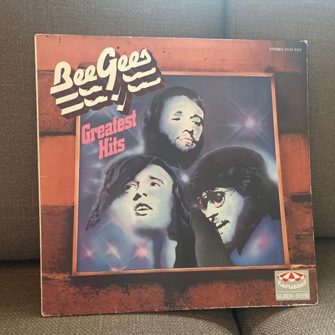 Bee Gees Stayin' Alive vinyl singel med cover. Singelen er en 7-tommers plate med svart vinyl.