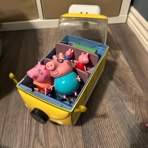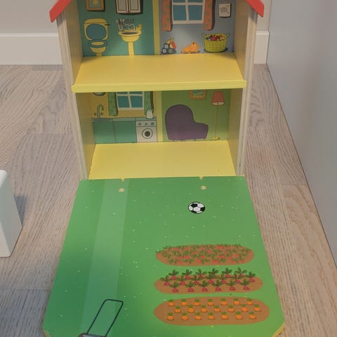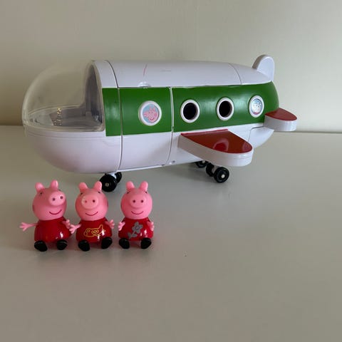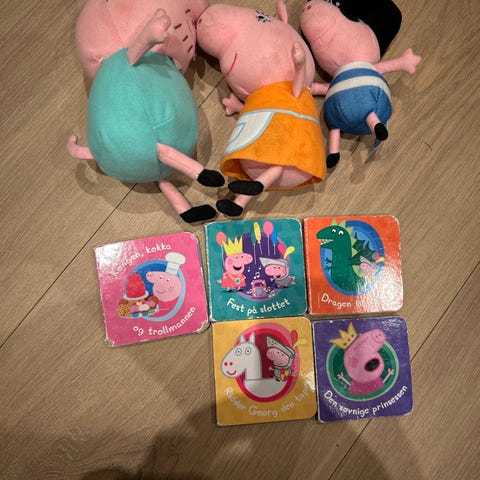 Peppa Gris lekesett som inkluderer en figur av Peppa Gris, et lite lekeområde med møbler og tilbehør. Settet har detaljer som en lampe, kasseapparat og parasoll. Passer for barn som liker rollelek og Peppa Gris-tema.