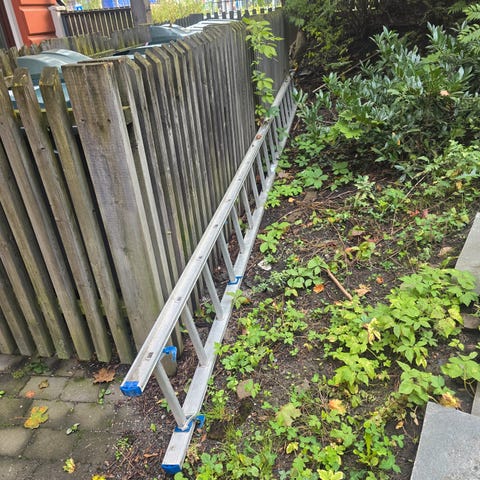 Proff stige, hver del er ca 460 cm. Hjul i delen som er mot veggen.