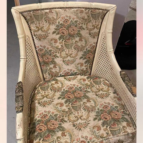 To stoler: Også i rotting, ed originalt stofftrekk med blomstermønster