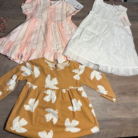 Nydelig kjolepakke til jente i str 86 bestående av olakjole fra Reserved, blomsterkjole fra Newbie og en helt ny kjole fra HM. Kjolene som er brukt, fremstår som nye. Kjøpes gjennom Fiks ferdig.