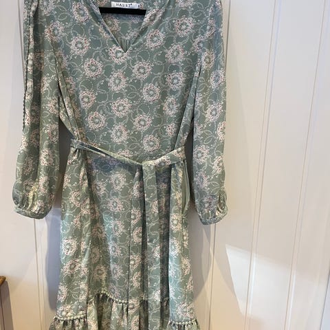 Skjult glidelås i siden. Falsk wrap/omslag. Flatterende snitt. Noe grønnere i fargen i virkeligheten.