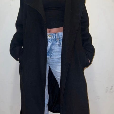 Sort tidløs kåpe i ullblanding 55%ull og 45%polyester fra Lindex. Xs men føles som en Small.