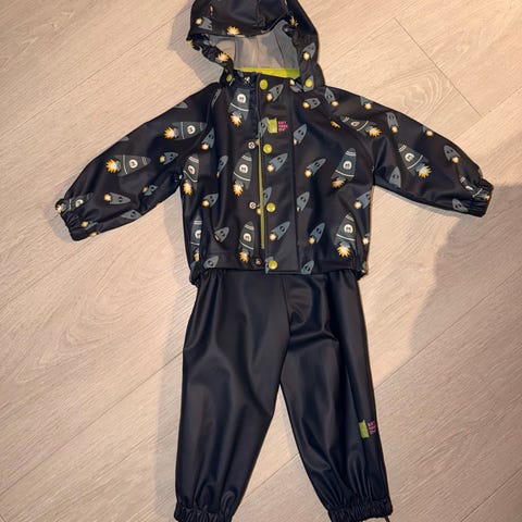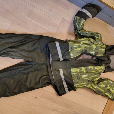 Refleksdetaljer på både jakke og bukse gir ekstra synlighet. Alle trykknapper og strikker fungerer som de skal. Ingen hull eller lekkasjer.