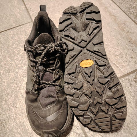 La Sportiva fottursko i størrelse 38. Skoene har en slitesterk yttersåle med godt grep, egnet for fotturer. Fargen er svart med røde og blå detaljer. Designet for å gi støtte og komfort under utendørs aktiviteter.