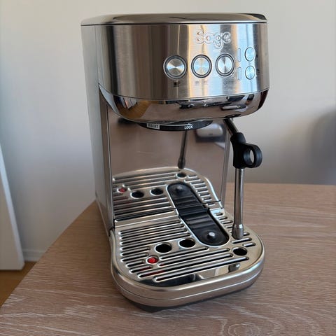 Pent brukt Sage Bambino Plus espressomaskin i rustfritt stål, har kun vært benyttet som reserveløsning når større maskin har vært på service. Kjøpt i 2024 på Elkjøp.