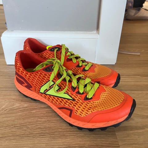La Sportiva fottursko i størrelse 38. Skoene er designet for fottur og har en fargekombinasjon av blå, rosa og grønn. De har solid yttersåle med godt grep, egnet for tur og utendørs bruk.