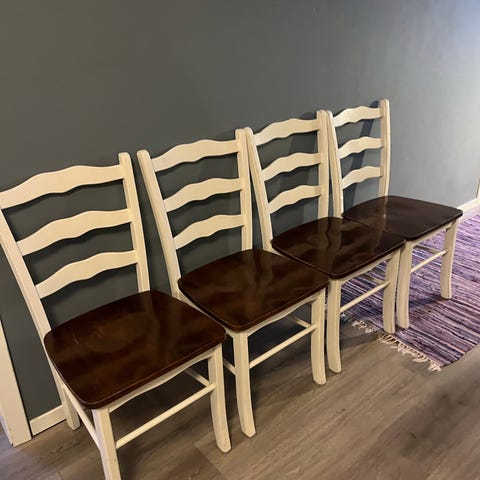 4 godt brukte spisestoler fra Skeidar, tror eg. Usikker. Gis bort. Se bilder for merker, det ser man på hvit trekk. Har prøvd å vaske 1 gang. Førstemann til mølla. Må hentes. Trenger du bare en eller to går det fint.