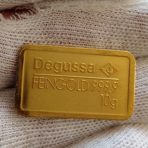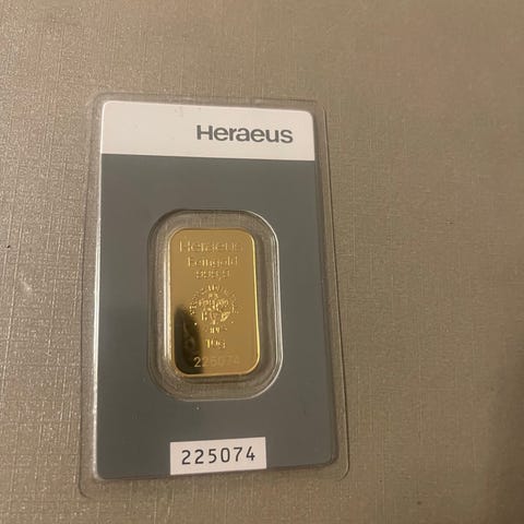 Heraeus 1 oz gullbarre med en renhet på 999.9. Baren er laget av fint gull og kommer i en beskyttende kapsling.