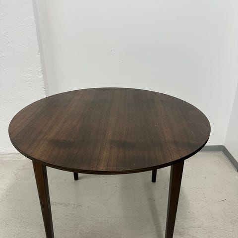 Selger mitt kjære spisebord i eggehvit. Det følger med to ilegges plater. Diameteren på bordet er 105 og hver ilegges platene er på 30 cm , 165 cm lang med platene totalt . Bordet er godt brukt og har flere merker på seg. Den ene uttrekkskinnen har hatt en brist i seg men er limt, har vært slik så lenge jeg har hatt bordet men anbefaler å være litt forsiktig med å trekke platene fra hverandre (se bilde)
