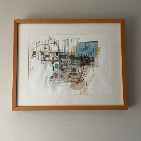 Abstrakt maleri med varme farger som gult, grønt og rødt. Motiv viser to figurer i en kunstnerisk og udefinert stil. Passer til dekorasjon av hjem eller kontor.