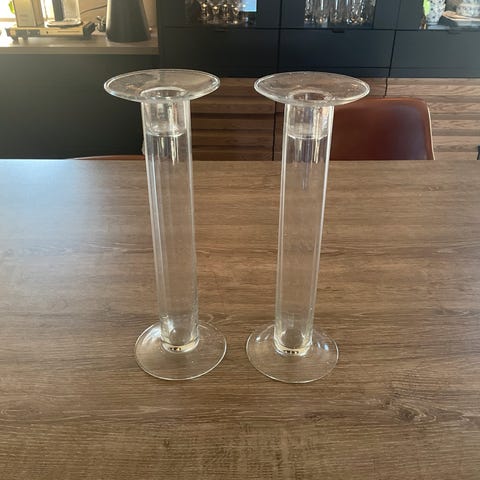 To dekorative telysholdere / små vaser i riflet glass selges samlet.