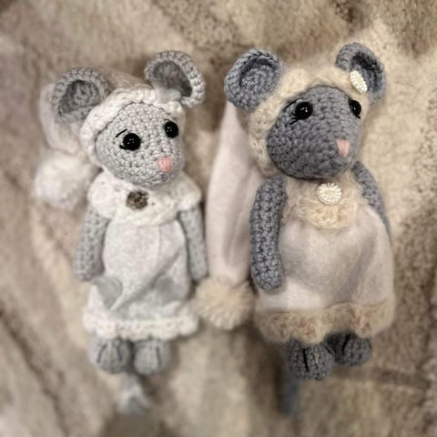 Sett med håndheklede bamser og kosedyr i ulike farger og design. Laget av garnmateriale, egnet som barneleker eller dekorasjon. Pris fra 150
