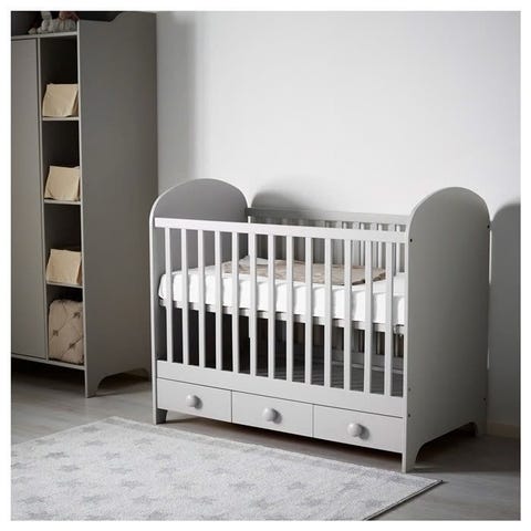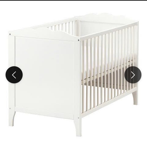 IKEA Sprinkelseng barneseng med trestruktur og brun beskyttelseskant. Inkluderer madrass med hvitt trekk. Egnet for barn.