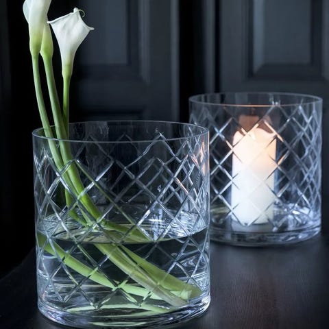 To dekorative telysholdere i klart, strukturert glass selges samlet.