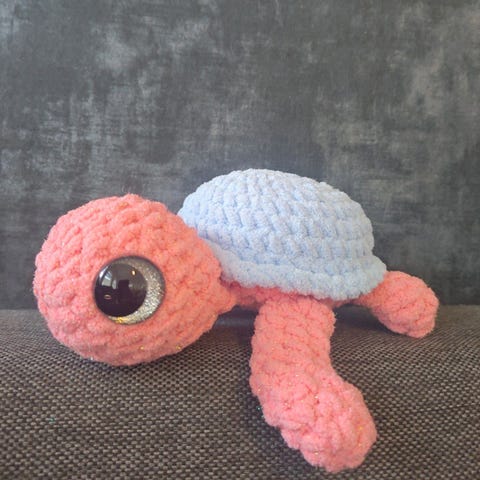 Heklet kanin bamse med rosa kjole. Myk og håndlaget tekstildukke, egnet som leke eller dekorasjon.